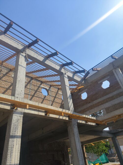 A photo of the office building under construction, with a Mangalore-tiled roof and traditional Indian architecture design features A photo of the office building under construction, with a Mangalore-tiled roof and traditional Indian architecture design features