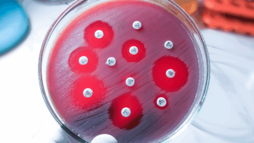 A petri dish showing bacterial growth resistance to certain antibiotics